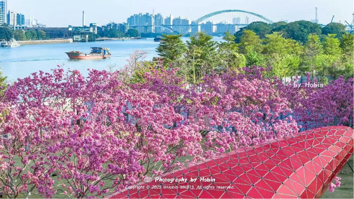 午📍广船滨江公园日光偶合,缀满枝端的粉紫色花朵与鹤洞大桥、滨江惬心交相衬映为荔湾的暖冬勾画出最绚丽的色调