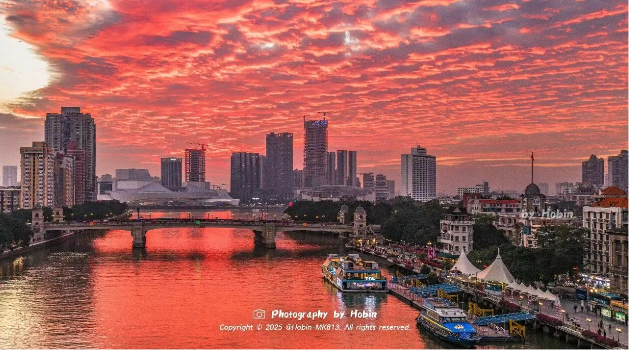 📍荔湾江面晚霞西堤船埠(沿江西路)夕阳落下,江面被染成琥珀色迷东说念主的色调将荔湾点缀得祥和又预备